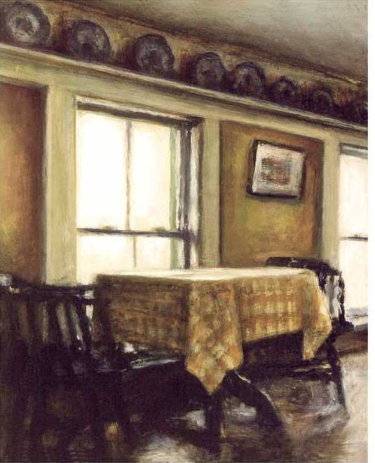 ELIZABETH SOLOMON defines her work as documentation that “pays homage to intimism - the tradition in art that gives significance to the familiar, unnoticed and unguarded moments of everyday life.” The visual representation of her “domestic geography” has a Hopperesque quality. But where Hopper's paintings of landscapes and “waiting” rooms are often scenes of isolation that evoke feelings of desolation or alienation, Solomon’s “scapes” and “rooms” are inviting and warm: a lamp lit to show the way to a chair; a chair offering up its arms to embrace us. The dishes washed at the end of the meal, after the guests are gone, stand ready to repeat the service for us. Like a set of scales in suspended balance all these works present an active and fervent form of waiting. This is not “the familiar made strange” of “postmodernism” but the familiar made profound by passionate intensity. The guest at the Thanksgiving dinner whose presence enlarges the family, and the meaning of the meal, is shown completely and unselfconsciously absorbed in the act of helping himself to some food. A woman asleep over her book is lovingly portrayed in a moment of innocence and vulnerability that becomes perdurable. An open window, defined by a billowing yellow curtain that brings with it the sound and smell of the nearby sea, evokes the very essence of a late summer Sunday morning. Through all these different moments the paintings of Elizabeth Solomon, like those of Vermeer, offer the viewer the rarest of gifts - a glimpse of everyday life caught in the web of infinity.